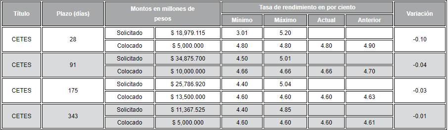 Resultado de subasta CETES.
