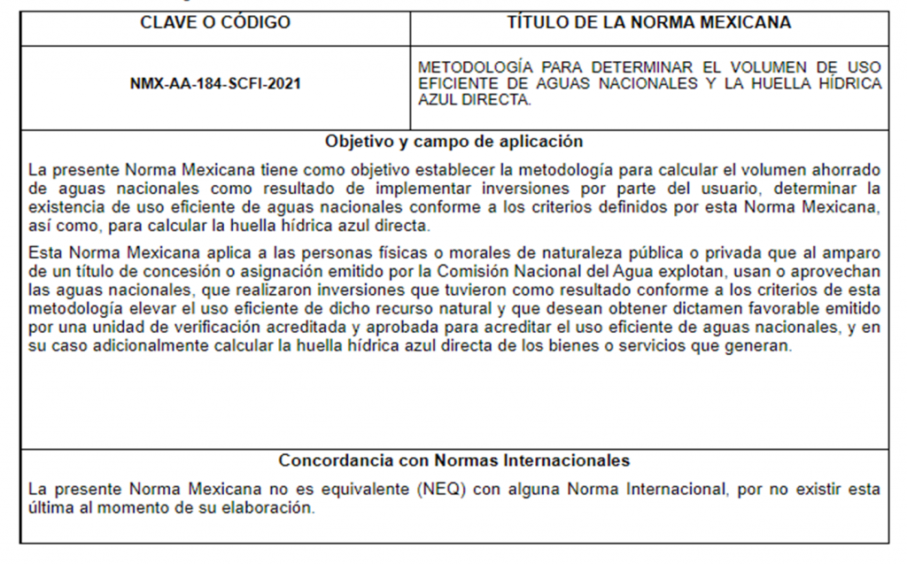 DECLARATORIA DE VIGENCIA DE LA NORMA MEXICANA NMX-AA-184-SCFI-2021, METODOLOGÍA PARA DETERMINAR EL VOLUMEN DE USO EFICIENTE DE AGUAS NACIONALES Y LA HUELLA HÍDRICA AZUL DIRECTA.