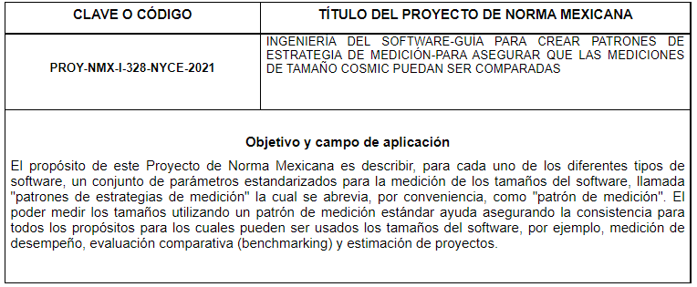 AVISO DE CONSULTA PÚBLICA DEL PROYECTO DE NORMA MEXICANA PROY-NMX-I-328-NYCE-2021, INGENIERÍA DEL SOFTWARE-GUÍA PARA CREAR PATRONES DE ESTRATEGIA DE MEDICIÓN-PARA ASEGURAR QUE LAS MEDICIONES DE TAMAÑO COSMIC PUEDAN SER COMPARADAS.