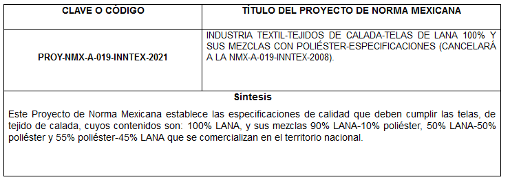 AVISO DE CONSULTA PÚBLICA DEL PROYECTO DE NORMA MEXICANA PROY-NMX-A-019-INNTEX-2021, INDUSTRIA TEXTIL-TEJIDOS DE CALADA-TELAS DE LANA 100% Y SUS MEZCLAS CON POLIÉSTER-ESPECIFICACIONES (CANCELARÁ A LA NMX-A-019-INNTEX-2008).