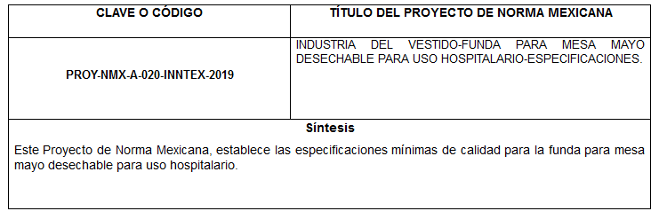 AVISO DE CONSULTA PÚBLICA DEL PROYECTO DE NORMA MEXICANA PROY-NMX-A-020-INNTEX-2019, INDUSTRIA DEL VESTIDO-FUNDA PARA MESA MAYO DESECHABLE PARA USO HOSPITALARIO-ESPECIFICACIONES.