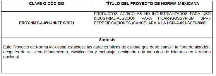 AVISO DE CONSULTA PÚBLICA DEL PROYECTO DE NORMA MEXICANA PROY-NMX-A-051-INNTEX-2021, PRODUCTOS AGRÍCOLAS NO INDUSTRIALIZADOS PARA USO INDUSTRIAL-ALGODÓN PARA HILAR-(GOSSYPIUM SPP)-ESPECIFICACIONES (CANCELARÁ A LA NMX-A-051-SCFI-2000).