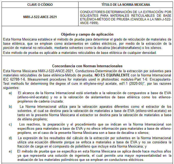 DECLARATORIA DE VIGENCIA DE LA NORMA MEXICANA NMX-J-522-ANCE-2021, CONDUCTORES-DETERMINACIÓN DE LA EXTRACCIÓN POR SOLVENTES PARA MATERIALES RETICULABLES DE BASE ETILÉNICA-MÉTODO DE PRUEBA (CANCELA A LA NMX-J-522-ANCE-1999).